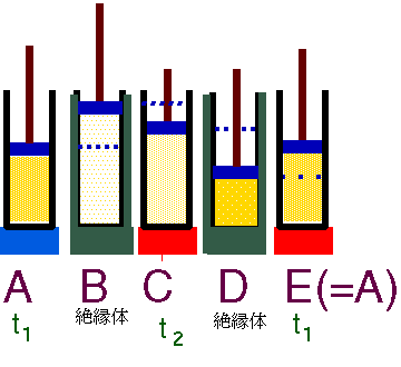 例えば、シリンダーに気体を詰め、熱源 においたままピストンをゆっくり上げ、B の体積と圧力にし、 そのあと熱源から離し、体積を変え、C とする。温度は低くなり、 となったとする。 この温度を保ちながら、ピストンをゆっくり下げ、C の体積と圧力にしたあと、 またこの熱源 から離し、 A の状態に戻す。