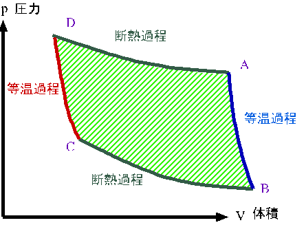 これを圧力 p と体積 V のグラフで見ると、このような感じになる。