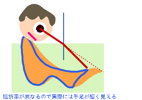 風呂で手足が短く見えるのは、 光の進行方向が変化したためである。