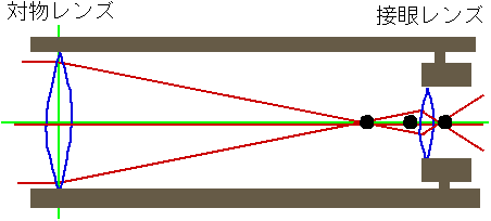 凹鏡を使った反射望遠鏡式の望遠鏡もあるが (ハワイにある天文台で使用する望遠鏡「すばる」など)、 もっとも知られている屈折式望遠鏡は、 2 つの凸レンズを使用している。